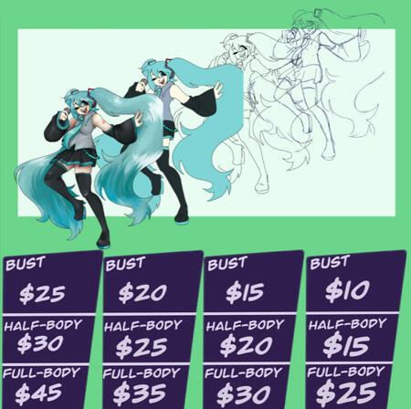 A flat color bust costs 20 USD, half-body 25 USD, and full-body 35 USD. An additional character costs 5 USD extra for busts, and 10 USD extra for half-body and full-body.